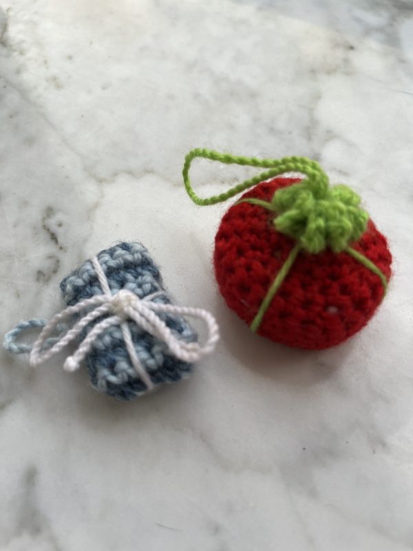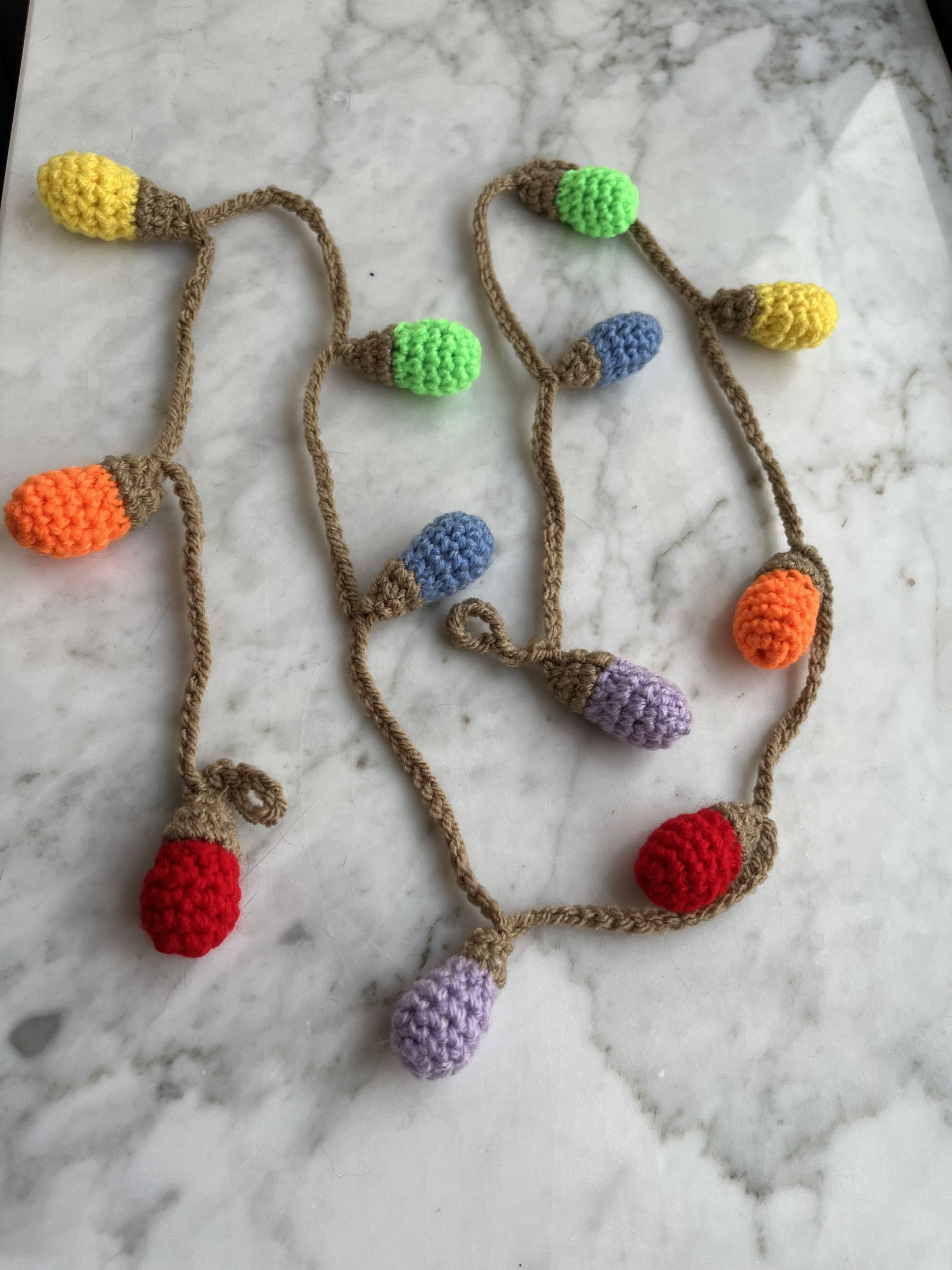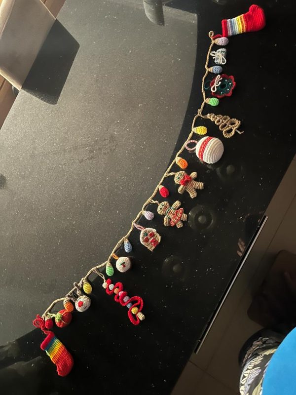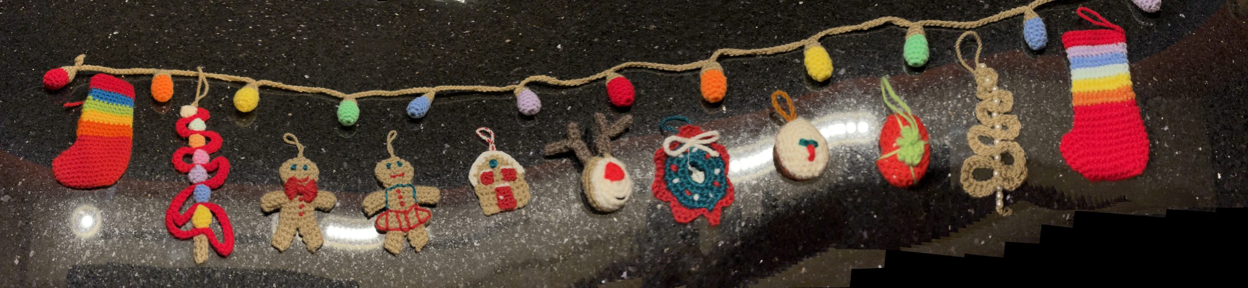 Crochet a string of Christmas Lights and a variety of decorations to hang on a tree or on a wall for Christmas cheer! Decorations include stockings, a reindeer, mini Christmas trees, a pudding, a gingerbread house, a gingerbread man and woman, baubles, a wreath and assorted gifts.