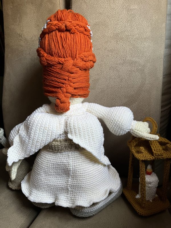 The Angel has long red hair in an elaborate upstyle with a tiara. Her facial features are simply angelic. She can be customised to be cream, tan or brown; boy or girl; with simplified, long and straight or short and curly hair.
